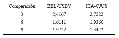 En la Tabla. 5 se observa que para BEL-USBV el mejor k, en términos de desempeño es k =6, por el contrario, para ITA-CJUS, el mejor es k =9, teniendo en cuenta que no hay diferencia estadísticamente significativa entre k=6 y k=9 para BEL-USBV (Tabla. 6), se concluye que k=9 es el más adecuado para imputar ambas bases de datos.