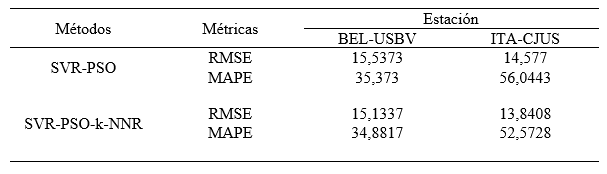 En la Figura. 7 se observa la comparación entre los desempeños obtenidos luego de la predicción SVR-PSO y SVR-PSO-k-NNR. Se aplicó el test Mann-Whitney, el cuál arrojó un P-valor de 0,9416 para BEL-USBV y 0.0990 para ITA-CJUS, lo cual indica que no existe una diferencia estadísticamente significativa luego de realizar la imputación, lo que sugiere que este proceso no afectó el desempeño de la predicción como se constata en la Tabla. 7 en donde se muestra que los errores en ambos sistemas SVR-PSO y SVR-PSO-k-NNR se conservan.