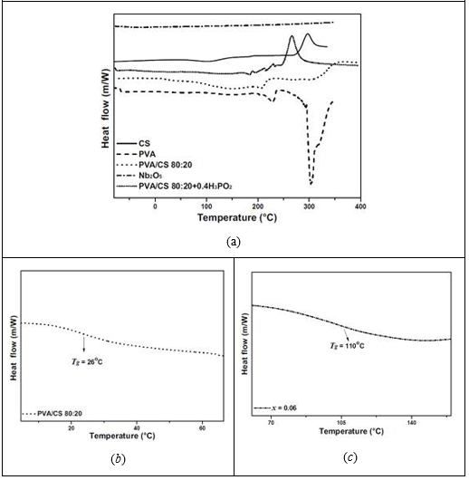 Las curvas de cambios térmicos, debidos bien sea a transiciones de fases o reacciones de descomposición, obtenidas a partir del análisis térmico de las membranas y de los polímeros precursores PVA, CS, ácido hipofosfórico y el cerámico Nb2O5, mediante la técnica de calorimetría diferencial de barrido se observan en la figura 1a.
