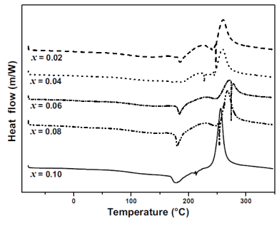 Los termogramas de la figura 2 corresponden a las membranas de PVA/CS 80:20 + 0.4 H3P02 + xNb2O5 con x = 0.02 hasta x = 0.1. Para todas las concentraciones se observa la Tg alrededor de los 110 °C la cual está por arriba que la de los precursores, ver por ejemplo para x = 0.06 en la figura 1c. Luego se observa un pico alrededor de los 180 °C debido a una anomalía endotérmica con una temperatura de arranque 171 °C y una entalpia de 19.3 J/g el cual corresponde al punto de fusión. Finalmente se observa otro pico exotérmico alrededor de 256 °C con temperatura de arranque de 245 °C y una entalpia de -187.2 J/g debido al rompimiento de las cadenas del polímero y a su descomposición, similar a lo observado para el quitosano.