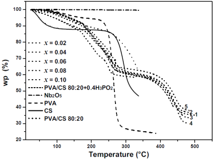 Para las otras curvas de TGA correspondientes a PVA/CS 80:20 + 40%H3PO2 (línea punteada acortada) y PVA/CS 80:20 + 40%H3PO2 + x%Nb2O5 con concentraciones de x = 0.02 (línea punteada 1), 0.04 (línea punteada 2), 0.06 (línea punteada 3), 0.08 (línea punteada 4) y 0.10 (línea punteada 5), la complejidad de la pérdida de masa es similar. Así, tenemos una pérdida de peso desde 25 °C hasta alrededor de 170 °C del orden de 14% debido al proceso de deshidratación de la membrana, luego se observa otra caída abrupta de peso desde 170 °C hasta alrededor de 270 °C del orden de 26%, seguida de una caída lenta de peso de los 270 °C hasta los 400 °C y finalmente por arriba de 400 °C otra caída abrupta que corresponde a un peso del orden del 30%.