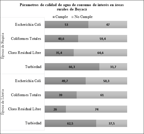 Los resultados de los parámetros de calidad de agua para las muestras analizadas se presentan en la figura 1. Alrededor de 60% de los acueductos no cumplen con el valor máximo permisible de coliformes totales de 0 UFC (Unidades Formadoras de Colonias) /100 cm3, consecuentemente, 50% reportan E. coli (0 UFC/100 cm3). Cerca de 60% de los sistemas de abasto no cumplen con el rango de 0,3 a 2,0 mg/L Cl2 de desinfectante libre en red de distribución. Se observa que tanto en época de lluvias como de sequía más de 60% de los acueductos cumplen con el límite máximo permisible de 2 Unidades Nefelometrías de Turbiedad (NTU) para el parámetro de turbiedad.