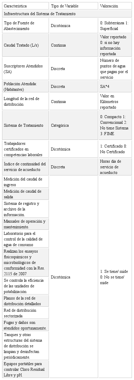 Las variables independientes fueron seleccionadas a partir del Formulario Único de Inspección Sanitaria, correspondiente al Anexo Técnico 1 de la Resolución 082 del 2009. Este formulario reporta información in situ de los sistemas de abastecimiento de agua de consumo en cuanto a unidades de potabilización, instrumentación, red de distribución y operación del sistema. Se consideró que las variables infraestructurales empleadas para el análisis concordaran con los lineamientos establecidos en el Manual para el Desarrollo de Planes de Seguridad del Agua que permitieran realizar una evaluación general de riesgos en abastecimientos de agua de consumo OMS. (2009). Además, se creó una variable dicotómica tratada como 1 cuando el acueducto tenía sistema de tratamiento, sin importar el tipo, y 0 cuando no contaba con infraestructura de potabilización.