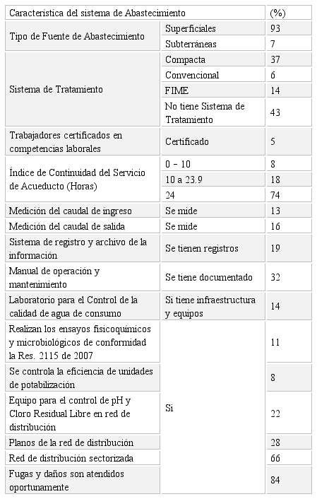 El caudal a tratar que ingresa a las unidades de potabilización en promedio era de 2 L/s ± 3,3, con un valor máximo de 6,7 L/s; 59% de los acueductos no estiman la cantidad de agua que ingresa al sistema de potabilización, 15% de los acueductos abastecen 50 usuarios o menos, 2,4% cuentan con más de 1000 usuarios, con una media de 212 usuarios por sistema de abastecimiento. En cuanto a la longitud de la red de distribución, se puede mencionar que, existen 22 acueductos que desconocen el número de kilómetros de la red que componen el sistema de distribución, en promedio cada acueducto cuenta con 11 Km ± 3,7 de tubería y se observa un valor máximo de 32,6 Km. Las demás características infraestructurales de los acueductos se describen en la Tabla 2.