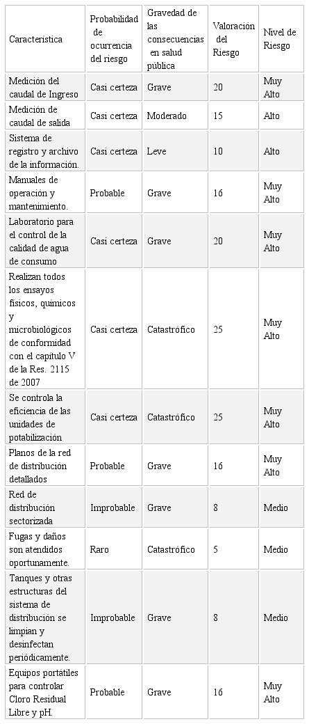 Posteriormente, de cada variable infraestructural se estimó el nivel de riesgo empleando una matriz semicuantitativa de puntuación del riesgo. Primero, se estimó la probabilidad de ocurrencia del riesgo en una escala de 1 a 5. Donde dada la frecuencia en los sistemas de abastecimiento, se categorizo 1 como raro (0% a 20%), 2 Improbable (21% a 40%), 3 moderado (41% a 60%), 4 probable (61% a 80%) y 5 casi certeza (81% a 100%). Luego, se valoró la gravedad de las consecuencias de cada riesgo en salud pública, en una escala de 1 a 5, siendo 1 Insignificante y 5 Catastrófico. Esto considerando la implicación del incumpliendo de las características fisicoquímicas y microbiológicas del agua suministrada y la insuficiencia del sistema de potabilización o distribución en la protección de la salud de los usuarios de los acueductos, a corto, mediano y largo plazo. Posteriormente, se clasificó el nivel de riesgo de cada una de las variables infraestructurales, a partir de la puntación del riesgo, como, Bajo (<6), Medio (6-9), Alto (10-15) y Muy Alto (≥16) OMS. (2009); OMS. (2017); Amézquita - Marroquín, Pérez – Vidal, y Torres – Lozada. (2014).