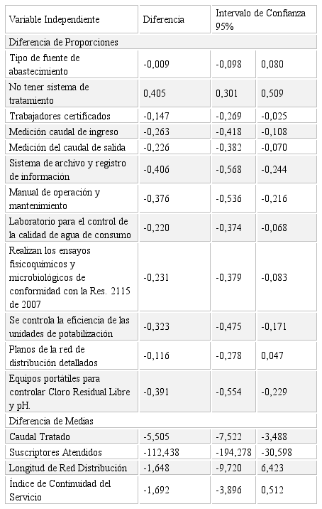 Adicionalmente, se encontraron diferencias estadísticamente significativas cuando, el acueducto calcula el caudal de ingreso del agua (diff -0,27; IC 95%, -0,43- -0,11) o de salida al sistema de tratamiento (diff -0,19; IC 95%, -0,33- -0,06), se tiene un sistema de registro y archivo de información de las actividades diarias del operario (diff -0,31; IC 95%, -0,44- -0, 18) y se documenta el manual de operación y mantenimiento del sistema de potabilización (diff -0,20; IC 95%, -0,30- -0, 11), entre los subgrupos de la variable dependiente CAT.