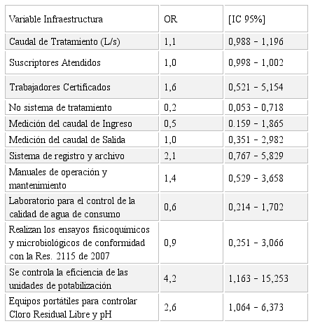Resultados: no contar con un sistema de tratamiento reduce en 0,2 (IC 95% 0,05 - 0,72) los chances de cumplir con CAT en comparación con tener un tratamiento. Así mismo, si un acueducto controla la eficiencia de los procesos de potabilización se incrementan en 4,2 (IC 95% 1,16 - 15,25) chances de no superar CAT, en comparación con los sistemas que no realizan esta actividad operativa.