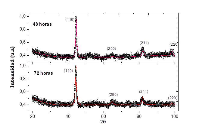 La Figura 1 muestra los patrones de XRD de polvos aleados mecánicamente del sistema Fe90Al10 molidos durante 48 y 72 horas. Se pude observar en todos los dos difractogramas picos con valores correspondientes a la familia de planos de la fase FeAl-BCC con parámetros de red casi iguales 2,886 ± 0,001 Å y 2,889±0,001 Å respectivamente. Las líneas del patrón de rayos x para las muestras con 48 horas de molienda son más anchos que las del patrón de 72 horas de molienda.