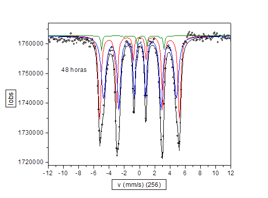 Los espectro Mössbauer de los polvos se ajustaron con una componente ferromagnética correspondiente a tres sitios ferromagnéticos mostrando un campo hiperfino medio de 29,1 T para las muestras con 48 horas de molienda y de 25,4 T para las muestras con 72 horas de molienda.