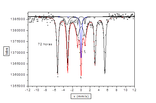 Los espectros Mössbauer se obtuvieron a temperatura ambiente usando un espectrómetro Mössbauer de transmisión con una fuente radioactiva de Co-57 inmersa en una matriz de rodio. Los espectros fueron ajustados con sextetos y singletes utilizando el software MOSFIT (Teillet y Varret). Se usó una muestra patrón de a-Fe como muestra de calibración.