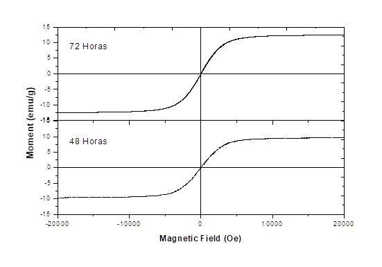 Finalmente, en la Figura 4, se observan los ciclos de histéresis obtenidos por VSM para las muestras de polvos aleados mecánicamente. De la muestra aleada durante 72 horas se obtiene un ciclo que nos permite clasificarlo como magnéticamente blando, con una saturación cerca de los