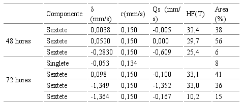 O espectro de Mössbauer dos pós foi ajustado com um componente ferromagnético correspondente a três sítios ferromagnéticos, mostrando um campo hiperfino médio de 29,1 T para as amostras com 48 horas de moagem e 25,4 T para as amostras com 72 horas de moagem.