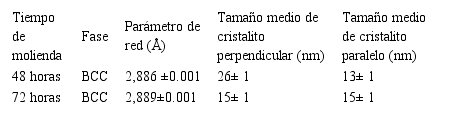 El valor del tamaño medio de cristalito perpendicular es de 26 ± 1 nm para la muestra con 48 horas de molienda mientras que el valor del tamaño medio de cristalito perpendicular es de 15 ± 1 nm para la muestra con 72 horas de molienda, Esto puede explicar el ensanchamiento de las líneas observadas en el patrón de la muestra de 48 horas de molienda. La tabla 1 reporta los resultados obtenidos de los ajustes de los patrones de XRD.
