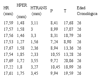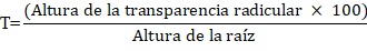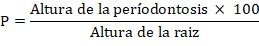 A partir de las medidas realizadas se calcularon la Periodontosis (P) y la Translucidez radicular (T) usando (1) y (2), respectivamente.