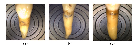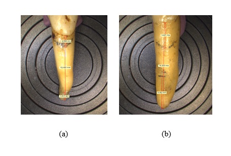 · La medida de la altura de la períodontosis (HPER (mm)): se aprecia como un área suave y amarillenta debajo del esmalte y es más oscura que éste, pero más clara que el resto de la raíz. Se realizó entre la unión cemento-esmalte y la línea de inserción del tejido blando. Véase Figura 2(b).
