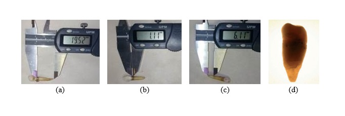 · La medida de la altura de la translucidez radicular (HTRANS (mm)): esta no aparece antes de los 20 años y se produce por el depósito de cristales de hidroxiapatita dentro de los túbulos dentinarios. Se realizó desde el ápice hasta la unión del cemento-esmalte en la superficie, haciendo uso de un negatoscopio para poder apreciar la zona de medida. Véase Figura 2(c) y 2(d).