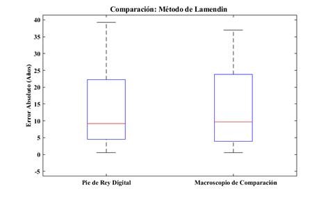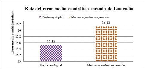 El método clásico de Lamendin, en la literatura científica presenta usualmente un error medio de 10,00 años cuando se usaron muestras dentales monorradiculares de origen francés. En contraste, al utilizar muestras al utilizar muestras dentales monorradiculares de origen colombiano se presenta una tasa de error de 15,52 años, es decir, este método se ve afectado por las variaciones morfológicas, fisiológicas y ancestrales, según las características de la población. Como se evidencia en los resultados obtenidos por medio del Método de Lamendin, al usar el pie de rey y el macroscopio de comparación, como instrumento de medición se demuestra que el RMSE entre la edad biológica y la edad cronológica fue mucho mayor, en comparación con el error promedio obtenido por Lamendin et al.