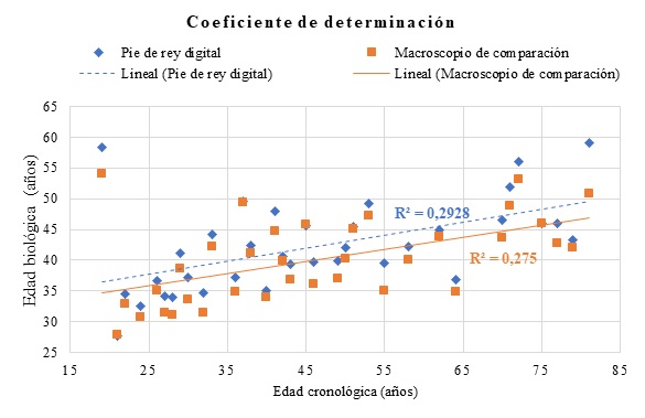 En la gráfica de la Figura 5, se muestra el coeficiente de determinación, el cual se calculó para las edades biológicas obtenidas del método de Lamendin.