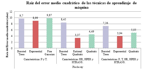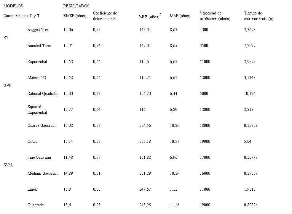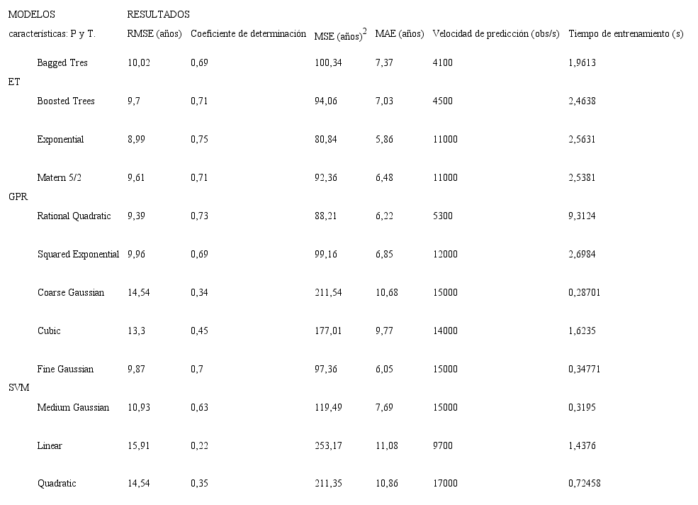 Los resultados obtenidos del entrenamiento utilizando selección de características: P y T. Mostrados en la Tabla 9, demuestran que la Técnica de aprendizaje de máquina GPR Rational Quadratic arrojó un RMSE de 10,33 años y un Coeficiente de determinación de 0,67. Siendo esta la técnica que realizo la mejor predicción. En este caso se tiene que, para dos características, los que tuvieron una mayor velocidad de predicción fueron: SVM Quadratic y SVM Cubic de 19000obs/s. El modelo que menor tiempo de entrenamiento tuvo fue SVM Coarse Gaussian con 0,25708s.