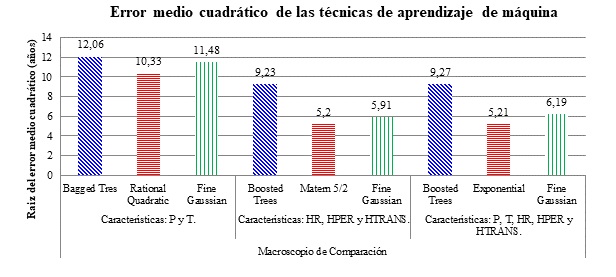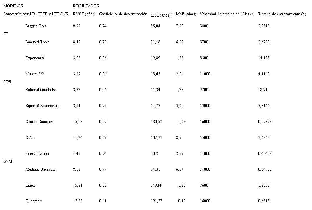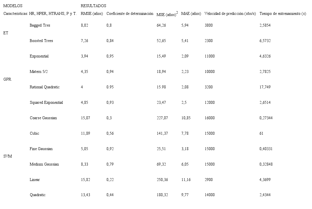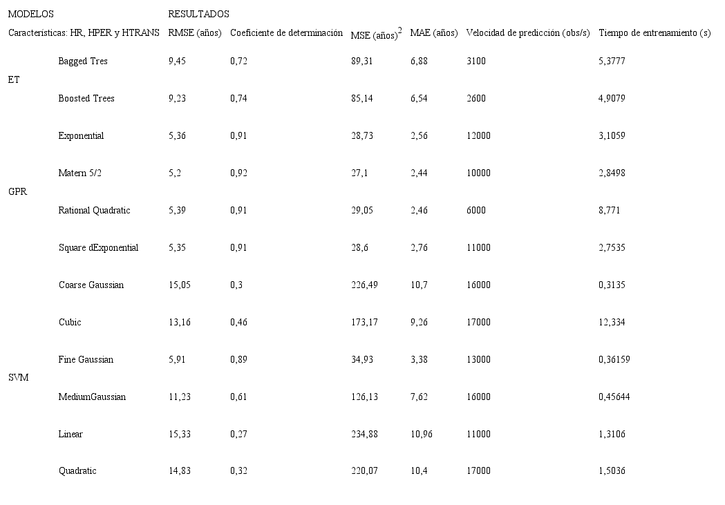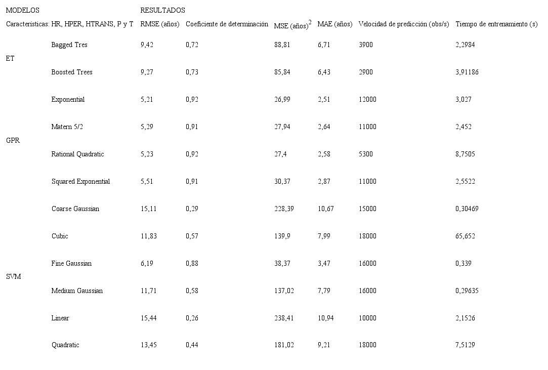 Los resultados obtenidos del entrenamiento en la aplicación Regression Learner utilizando selección de características: HR, HPER, HTRANS, P y T, mostrados en la Tabla 11, demuestran que la técnica de aprendizaje de máquina GPR Exponential arrojó un RMSE de 5,2 años y un R-squared de 0,92. En este caso se tiene que, para cinco características, los modelos que tuvieron una mayor velocidad de predicción fueron: SVM Quadratic y SVM Coarse Cubic, con 18000 obs/s. El modelo que menor tiempo de entrenamiento tuvo fue SVM Medium Gaussian con 0,29635s.