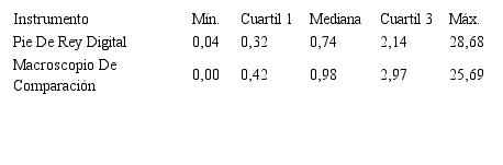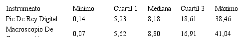 En la Tabla 12, están los datos obtenidos para cada instrumento, obtenidos de la comparación del método de Lamendin, respecto al error absoluto estimado, el mínimo, primer cuartil, la mediana, tercer cuartil y el máximo.