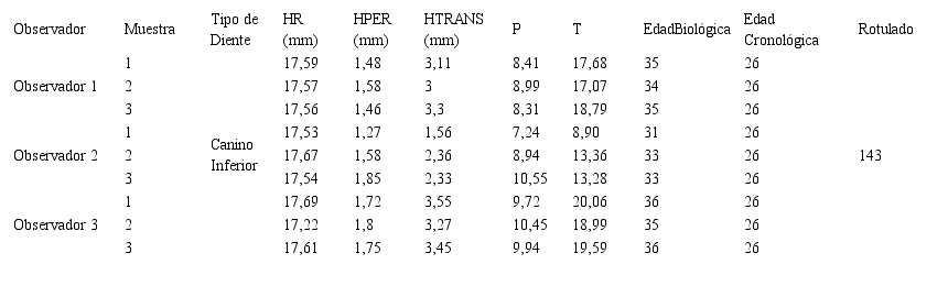 El protocolo de medición de la transparencia radicular (T) y la altura gingival o períodontosis (P) se realizó en el Laboratorio de Identificación Humana de la Fiscalía General de la Nación, Seccional Risaralda, donde se midieron: la altura de la raíz, altura de la períodontosis y altura de la translucidez radicular, por tres observadores distintos usando el mismo instrumento.