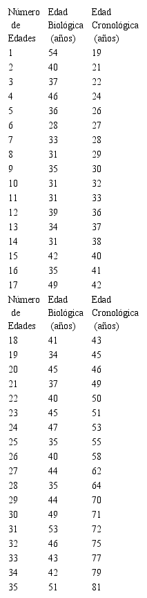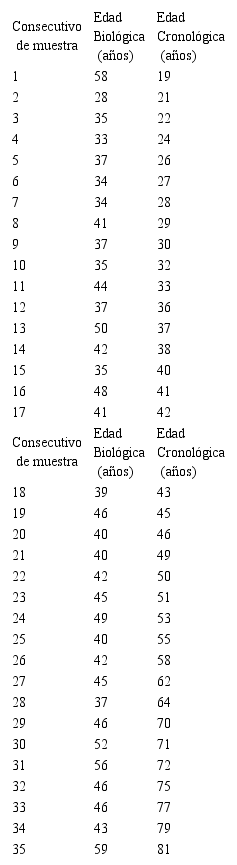 Las edades cronológicas de los individuos y las edades biológicas, obtenidas por medio del método de Lamendin, fueron utilizadas para realizar el cálculo de la raíz del error medio cuadrático (RMSE), error absoluto y el cálculo del coeficiente de determinación.