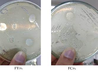 Figure 1 shows the halo inhibition test on Bacillus cereus of the films with 5% oregano essential oil. Remarkable differences are observed in both cases. The yam-based films showed inhibition of the growth of the bacteria about 1 mm from the edge of the film and also inhibition between the film and the agar, and the cassava starch based films showed no inhibition, even the bacteria could grow under the film specimens. This could be due to the different ratio of amylose: amylopectin between both tubers. The amount of amylose in the yam is higher, which allows a more compact and temperature resistant structure, this could promote the retention of OEO in the middle of the polymer matrix during the drying of the film and during the conditioning period. Furthermore, amylose has a linear helical structure whose interior is hydrophobic and allows similar substances such as essential oils to be absorbed Ortega-Toro, et al. (2014).