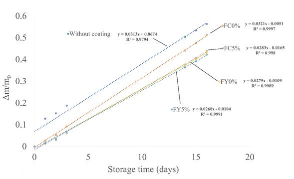 Regarding weight loss, significant differences were observed between the starch sources, the yam starch coatings being more suitable for protection against dehydration (Figure 2). In the same way, the presence of OEO promoted the decrease in the speed of weight loss. This was to be expected due to the hydrophobic nature of the oil. The grapes that dehydrated most easily were the uncoated grapes (rate of 0.0313g of water/day) and the ones that dehydrated more slowly were those coated with the yam-based material with 5% OEO (FY5% ) (rate of 0.0268g of water/day). The weight loss speed of the grapes with cassava control coating was 0.0321 g of water/day, when the OEO coating was applied it decreased to 0.0283 g of water/day. While with the yam control coating the weight loss rate is 0.0275 g of water/day and with the OEO-containing coating it decreases to 0.0268 g of water/day.