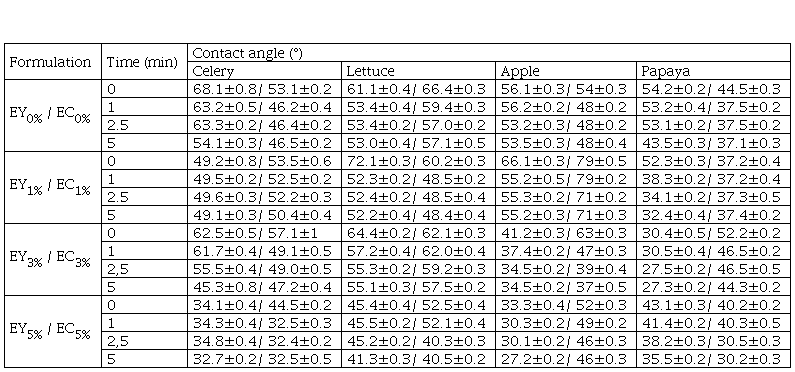 Table 1 shows the contact angle of the FFD on celery, lettuce, apple and papaya rinds. The yam and cassava starch dispersions showed high wettability on the food crusts studied. It was observed that as time passes the contact angle increased in all cases. The effect of the essential oil on this parameter seems to depend on the nature of the surface, in celery and papaya the addition of oil tends to cause a decrease in the contact angle; in lettuce and apple the contact angle increases with the addition of 1% OEO, but it decreases at higher concentrations and in papaya it decreases. In general, it is observed that vegetables (celery and lettuce) have higher humidity than fruits (apple and papaya). This may be due to a superficial treatment of the fruits, such as the use of waxes and gums, to preserve them for a longer time Khorram, et al. (2017). Regarding the starch source, it seems to have a little significant effect, it does not present a clear trend for this parameter.