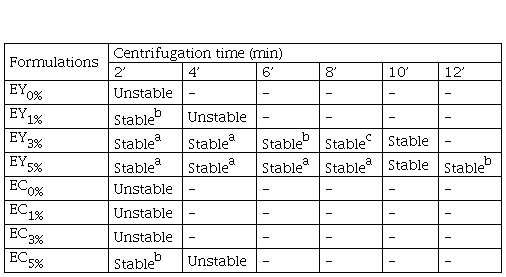 Table 2 shows the results of the stability test of the FFD under centrifugation conditions. Significant differences in the stability of the dispersions were observed depending on the starch source, the starch-based dispersions of yams being more stable than those of cassava, especially at OEO contents of 5%. The stability of dispersions with essential oils depends on Oswald maturation processes where the particle sizes grow and the phases separate Guerra-Rosas, et al. (2020) All the cassava starch-based dispersions presented instability before centrifugation during 2 min, except those containing 5% OEO.
