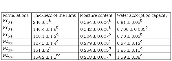 Table 3 presents the mean values and standard deviation for thickness, moisture content and water absorption capacity. It is observed that the yam control film has the greater thickness compared to the rest of the films and its values decrease with the increase of oil, this due to the plasticizing effect of the oil on the polymer matrix. In cassava starch-based films no significant differences in thickness were observed. The values obtained were similar to those obtained by Anchundia. (2016) which are in a range between 111 and 170 µm. Regarding the moisture content, it is observed that in general yam starch films contain more humidity than the base films of cassava starch and that its values tend to decrease with increasing oil content, which was to be expected due to the hydrophobic nature of the oil.