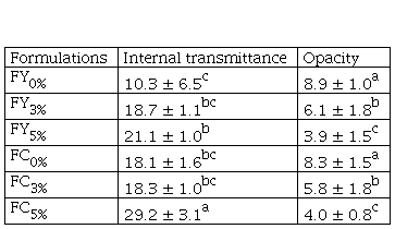Table 4 shows the mean values and standard deviation for internal transmittance and opacity measured at 450 nm. In general, yam starch films possess lower internal transmittance and slightly higher opacity than cassava starch films. On the other hand, the essential oil content increases internal transmittance and decreases opacity of the films. In agreement the effect of the amylose: amylopectin ratio of starches. This could be explained by the generation of free volume in the polymer matrix with the presence of oil, which acts as a plasticizer in the system. This would cause light to pass through the polymer matrix more easily, being reflected in higher internal transmittance values.