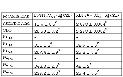 Table 5 shows the mean and standard deviation values of DPPH IC50 and ABTS IC50 of the studied films, ascorbic acid and oregano essence oil. All oregano essential oil (OEO) films showed antioxidant activity by increasing the amount of oil in the matrix. Regarding DPPH, it could be seen that the 5% oil films have about 10 times less antioxidant capacity compared to pure oregano oil and about 22 times less antioxidant capacity than ascorbic acid. There were no significant differences between the starch sources. In the case of the ABTS test, it can be seen that the films presented some considerable differences regarding the starch source, with the yam-based films being more antioxidant. This could be related again to the ability of yam starch to form more compact and stable structures that trap the added oil more efficiently than cassava starch inside Ortega-Toro, et al. (2014). It is also observed that the films with the highest antioxidant capacity (FY5%) have around 5 times less antioxidant capacity than oregano oil and around 13 times less antioxidant capacity than ascorbic acid.