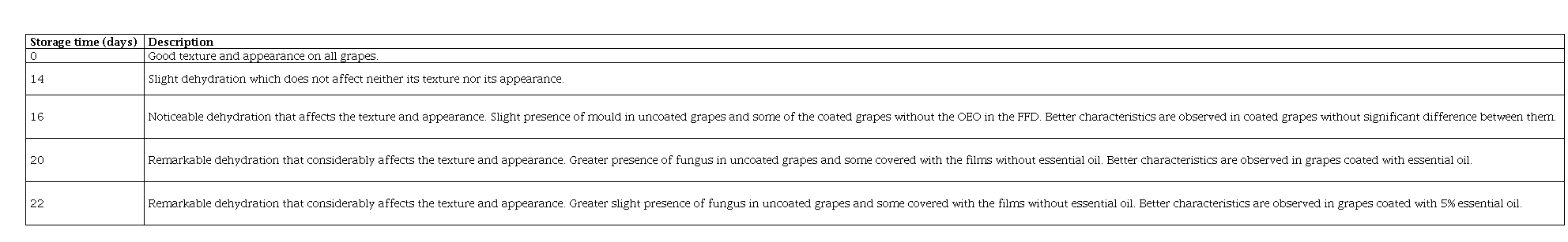 Table 6 presents the description of the grapes during the storage time and Figure 2 shows the change in weight of the grapes with and without coating during storage. In general, the effects of dehydration, loss of texture and appearance of mould at different times were visually detected. The uncoated grapes presented dehydration appearance sooner, and mould appeared in the uncoated grapes and in those coated with the materials without OEO. The grapes that were coated with materials containing 5% OEO showed an acceptable appearance until the end of the study.