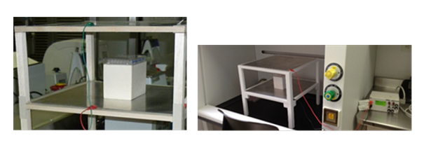 La Figura 10 muestra la caja de cultivo celular ubicada en medio de los electrodos a la altura de campo eléctrico homogéneo y el arreglo de los electrodos acoplados al equipo generador de la señal.