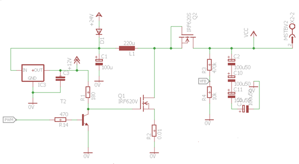 La Figura 1 muestra el diseño del regulador de voltaje en el software Eagle, de acuerdo a los valores calculados para los elementos del circuito. En el diseño fue considerado un regulador de voltaje adicional de 12 V para lograr la excitación del Mosfet.