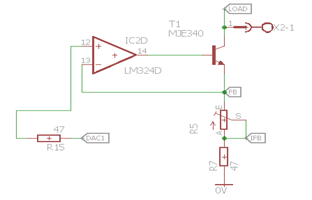 La Figura 2 muestra el circuito regulador de corriente dependiente de la resistencia de carga, con una corriente máxima esperada de 60mA. El valor mínimo que puede tener la resistencia de carga se calculó en 47Ω.