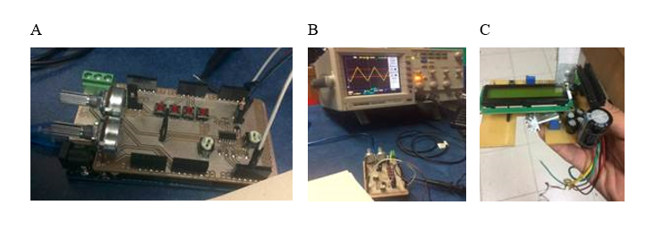 Finalmente, para la generación de las señales sinusoidal, triangular, diente de sierra y cuadrada, se realizó el código de programación con la tarjeta Arduino Due, siendo modificado e integrado con los sistemas de elevación de voltaje, regulador de corriente y rango de frecuencias requeridos. La validación se realizó comparando los valores registrados en la pantalla LCD, con los observados en el osciloscopio de referencia GDS-2062.