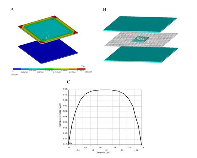 Por su parte, se logró simular el arreglo de placas paralelas encargadas de generar el campo eléctrico a la altura sobre la que estará ubicada la caja Falcom con el contenido celular. De la Figura 9 C se observan los valores de campo eléctrico inducido en el plano central de las placas (donde deberán ser ubicada las células). La gráfica presenta un aplanamiento en la curva de campo eléctrico para la distancia de 16 cm a 24 cm (8 cm). Contando que las placas son cuadradas, se garantiza un área de campo eléctrico homogéneo de 8cm x 8cm en la que deberán ir ubicadas las células cultivadas in vitro.