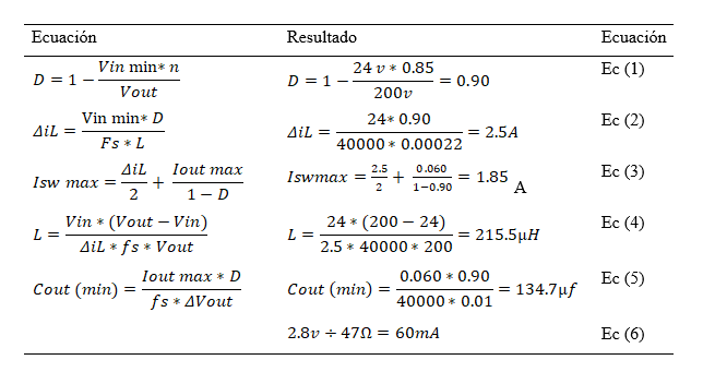 Posteriormente, de acuerdo a las recomendaciones de Instrument & Brigitte. (2014), fueron realizados los cálculos matemáticos para alcanzar el voltaje y corriente necesarios. Fueron determinados el elevador de voltaje tipo boost y el regulador de corriente. Las ecuaciones utilizadas para los diferentes cálculos son reportadas en la tabla de resultados.