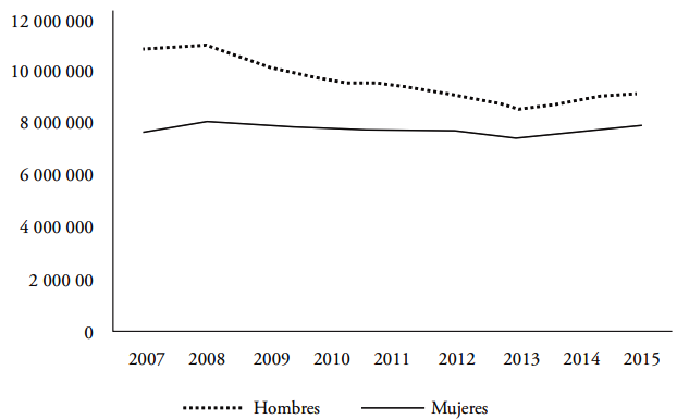 Se constata aquí que los mayores efectos en el desempleo masculino como consecuencia de la recesión económica ( Colectivo IOÉ, 2012 ) y su impacto en el sector de la construcción ( gráfica 1), son también un dato relevante para comprender que, con las mujeres autóctonas como pilares económicos del hogar, se haya mantenido la compra parcial de servicios de proximidad realizados por otras mujeres. La contribución económica de las españolas a los hogares, aunque en algunos de los casos sea escasa, está permitiendo sortear los efectos de la crisis en las familias en las que el hombre asumía la proveeduría principal del hogar ( Parella, 2013 ). El menor impacto del desempleo en las mujeres puede razonarse por el mayor deseo de permanecer fuera del espacio doméstico, aunque lo ocupen de manera parcial. Por igual, esto supone una estrategia provocada por la crisis, que permite a las familias españolas mantener los ingresos que los hombres dejan de aportar.