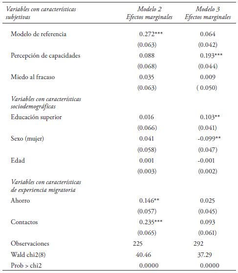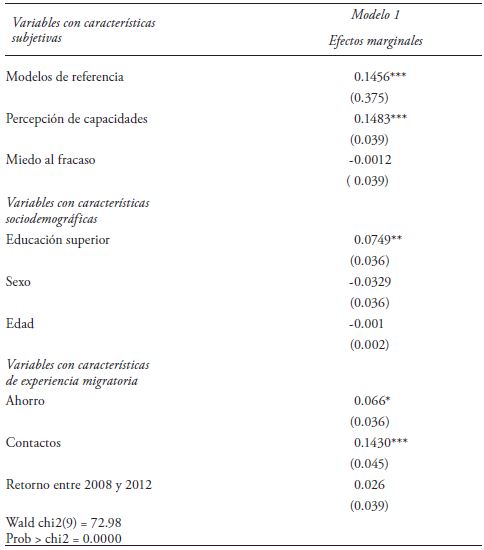 De acuerdo con los datos del cuadro 3, para los retornados que regresan al país en un contexto de crisis económica en los principales países de destino de los emigrantes, los factores asociados a la probabilidad de ser emprendedor son los contactos, el ahorro y tener modelos de referencia (conocer a otros emprendedores). Al igual que en el modelo 1, la asociación de los contactos es más fuerte y significativa que la de los ahorros. No se encontró asociación con la percepción de capacidades, el miedo al fracaso y las características sociodemográficas.