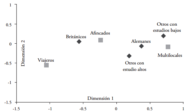 La gráfica 1 muestra cómo se distribuyen los distintos grupos en un plano de dos dimensiones, estando más cerca entre sí aquellos que son similares o están más relacionados entre ellos. La posición de cada uno de los grupos sobre la dimensión 1 indica que los británicos se distancian del resto de los grupos por país de nacimiento, puntuando en el sentido opuesto. Por tanto, los alemanes y el resto de retirados formarían un subconjunto aparte. Los tres grupos resultantes de las variables del comportamiento multilocal registran puntuaciones alejadas entre sí en el mismo factor, por lo que representarían realidades migratorias diferenciadas. Británicos y retirados afincados tienen puntuaciones similares (negativas) dentro de la dimensión 1, por lo que guardarían una relación más estrecha, mientras alemanes y el resto se relacionarían con los retirados multilocales.