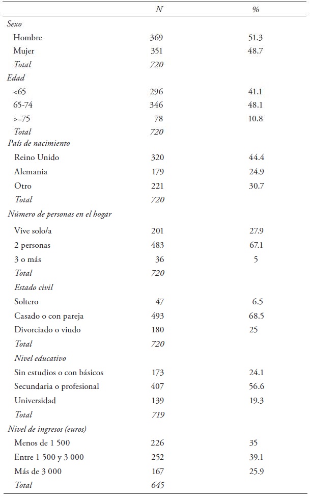 El cuadro 1 ordena las frecuencias observadas para cada una de las categorías de variables relacionadas con el perfil sociodemográfico de los retirados. En este sentido, los porcentajes indican que los migrantes de retiro en España conforman un grupo relativamente joven que no ha llegado a las edades más avanzadas. Sólo 11 por ciento de los encuestados supera los 75 años mientras que 4 de cada 10 no había cumplido todavía los 65 años. La mayoría ha migrado en compañía de otra persona, siendo una minoría los informantes que viven solos en España (28 %). En la muestra ambos sexos se distribuyen de forma equilibrada, los retirados que dicen estar casados o tener pareja representan 68 por ciento del total. La mayor parte de los informantes ha nacido en el Reino Unido (44 %), mientras que una cuarta parte lo ha hecho en Alemania y algo menos de un tercio corresponde a otro país europeo. Los retirados llegados a España pertenecen a las capas medias de la sociedad, si se tiene en cuenta que el grupo más numeroso es el compuesto por los hogares adscritos a la categoría intermedia, aquellos que perciben entre 1 500 y 3 000 euros al mes. En el mismo sentido, 57 por ciento de los informantes tiene estudios secundarios, muy por encima de los dos extremos de la escala, aquellos que han sido universitarios y los que han recibido una formación básica o carecen de estudios.