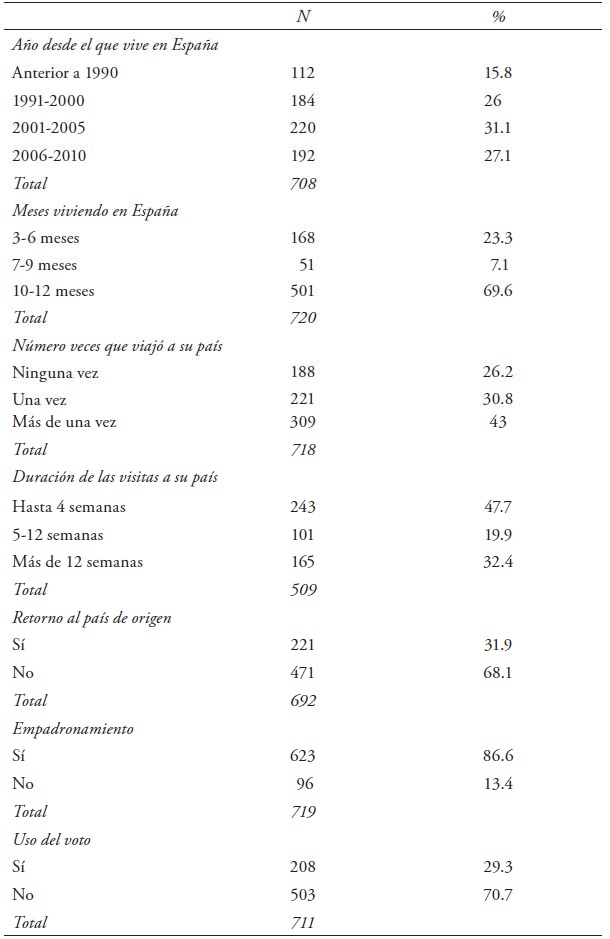 El siguiente cuadro muestra cómo se reparten los retirados entre las categorías de variables indicativas de su comportamiento migratorio y de su grado de integración ( cuadro 2). Considerando el año, a partir del que viven en España en el momento de ser encuestados, los informantes han llegado, como media, hace 10 años ( cuadro 2). 58 por ciento llegó con posterioridad a 2001, más de una cuarta parte entre 2006 y 2010.