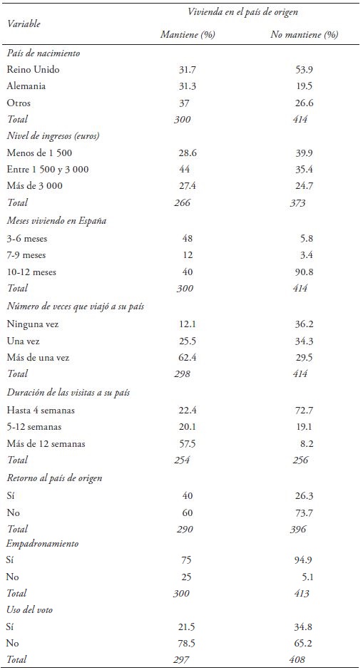 La multirresidencia, o el hecho de disponer de una vivienda en España y en su país de origen, se distribuye de forma desigual atendiendo al país de nacimiento y al nivel de renta de los retirados. Dentro del grupo de los que tienen en España su única vivienda preponderan las personas nacidas en el Reino Unido (54 %), mientras que en el grupo de propietarios en país de origen son más numerosos los informantes nacidos en otros países europeos (37 %). En relación con sus ingresos económicos, los primeros tienden a ubicarse en el nivel de renta más bajo (40 %). Los segundos destacan por concentrarse en la categoría inmediatamente superior, con ingresos entre los 1 500 y los 3 000 euros (44 %). La vivienda en el país de origen explica una forma concreta de mudanza. Los retirados que se han desprendido de vivienda viven entre 10 y 12 meses en España (91 %), no viajan a su país de origen (36 %) y, si lo hacen, permanecen allí menos de cuatro semanas (73 %). Aquellos con dos viviendas, una en cada país, viven en España entre 3 y 6 meses cada año (48 %), viajan a su país más de una vez (62 %) y se quedan allí por períodos superiores a 12 semanas (57 %). Esta última estrategia migratoria se acompaña de un nivel menor de integración de los encuestados en el municipio español en el que viven. De forma comparativa, piensan más en la posibilidad de retorno a su país de origen (40 %), son menos los que se registran en el padrón de habitantes (75 %) y participan con menor frecuencia en la política (21 %).