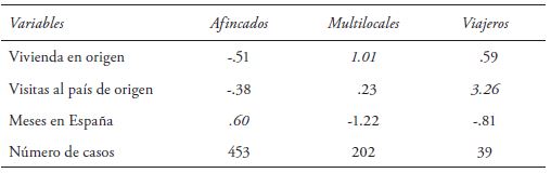 El análisis del comportamiento multilocal de los informantes identifica tres grupos ( cuadro 5), siendo el primero y más numeroso el de los retirados etiquetados como afincados. Reciben este nombre porque permanecen más tiempo en España, donde tienen su única vivienda, y presentan una movilidad menor hacia el país de origen. El segundo grupo es el de los retirados con un comportamiento multilocal, ya que destacan por tener una vivienda en cada país y por permanecer, de manera comparativa, menos meses en España, compartiendo un mayor tiempo de estancia anual en su país de origen.