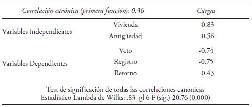 El análisis de correlación canónica identifica la situación de la residencia de los encuestados, el disponer de una vivienda en España y su antigüedad de residencia, como un factor explicativo de su grado de integración en España, medida a través de su empadronamiento, su participación en elecciones locales y su propensión (o no) a retornar a su país. El cuadro 6 recoge la carga o contribución de cada variable al modelo explicativo planteado. La correlación entre estos conjuntos de variables, expuestas como independientes y dependientes, es significativa según el test estadístico empleado ( cuadro 6). Dentro de la primera función, que maximiza la correlación lineal entre los dos conjuntos de variables, la vivienda en el país de origen es la variable independiente con una carga mayor (0.83), lo que implica que tener una vivienda en el país de origen es el factor más importante para explicar la integración en la vida española de los retirados. Por su parte, el número de años de residencia en España aporta con fuerza menor (0.56). Entre las variables dependientes, el registro en el municipio y la participación electoral contribuyen en la función de correlación con una intensidad similar. Según su signo ambas variables reaccionan en el mismo sentido, por lo que los retirados que mantienen la vivienda en su país no tienden a votar en España ni se empadronan en su municipio español de residencia. Además, imaginan la posibilidad de retorno, si bien esta variable participa menos de la función respecto a las otras dos variables dependientes (0.43).
