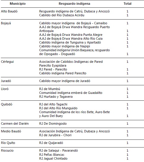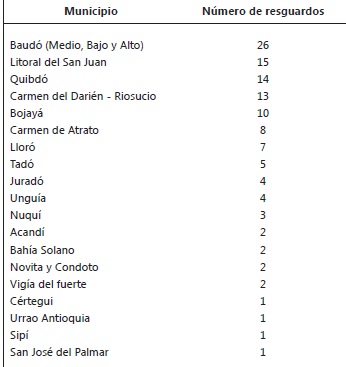 En la Tabla 1 se especifican cuántos resguardos indígenas hay legalmente constituidos en el departamento del Chocó y cuáles son los municipios que cuentan con mayor número de resguardos indígenas. Se puede observar que el mayor número de resguardos indígenas del departamento se encuentran en los municipios de Medio, Bajo y Alto Baudó, Litoral del San Juan y Quibdó.
